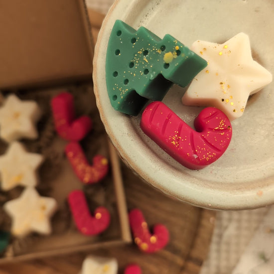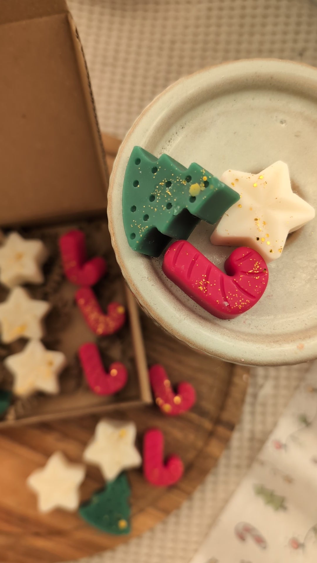 Chunky Christmas wax melts in 3 stunning Christmas scents and shapes. Handmade with a glitter that shines as the wax melts.