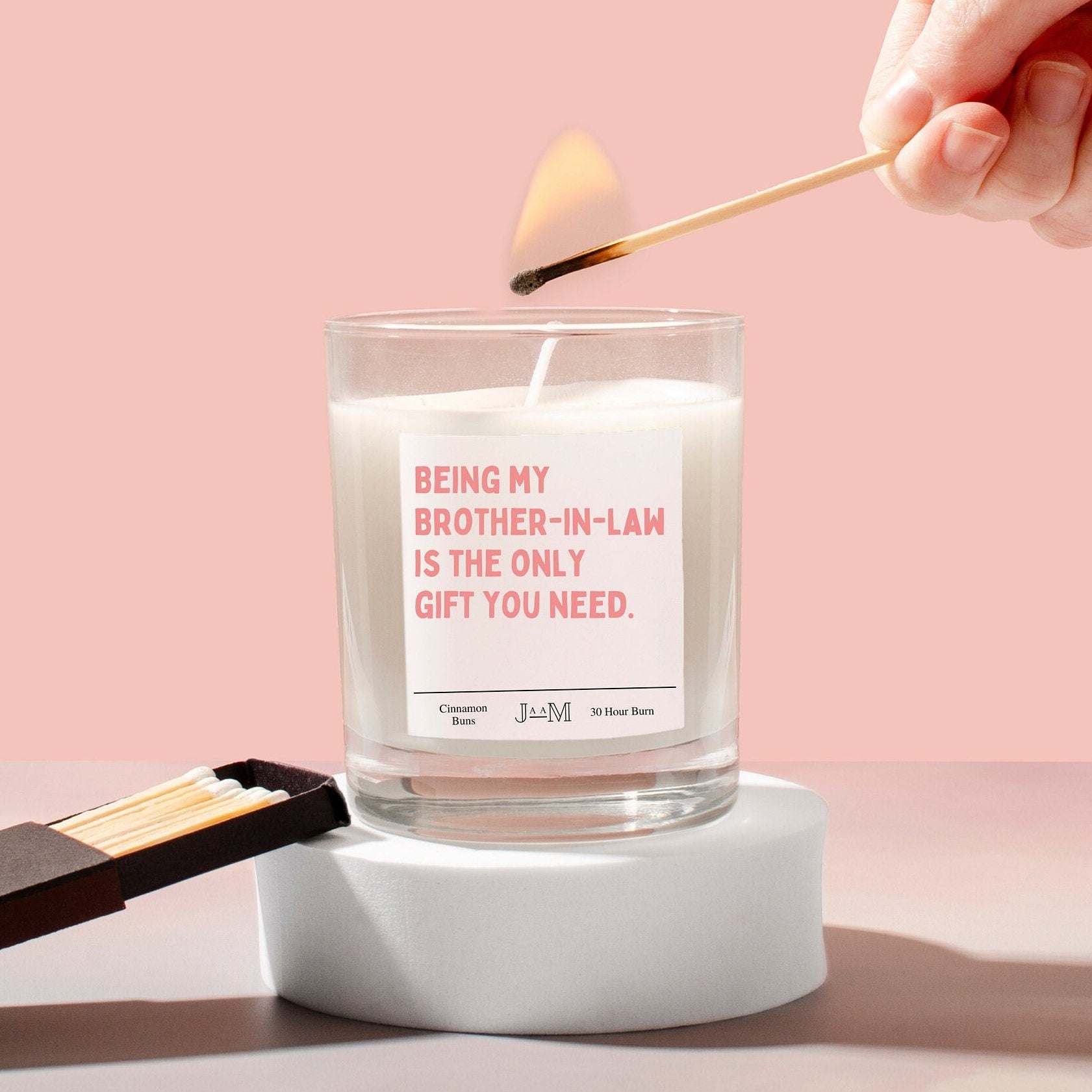 The candle reads 'being my brother-in-law is the only gift you need' in bold red letters on a premium white label.