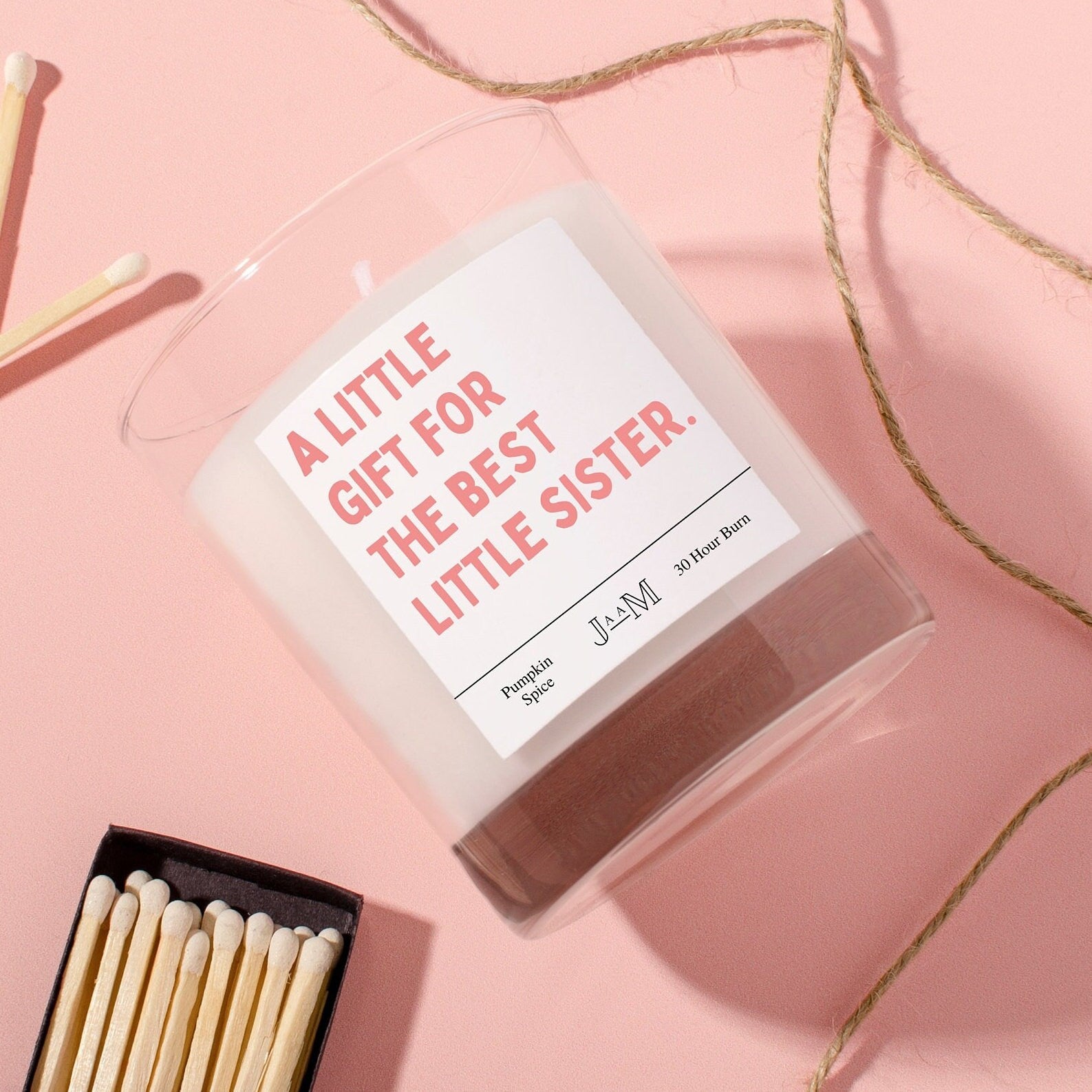 The candle reads 'a little gift for the best little sister' in red letters on a premium white label.