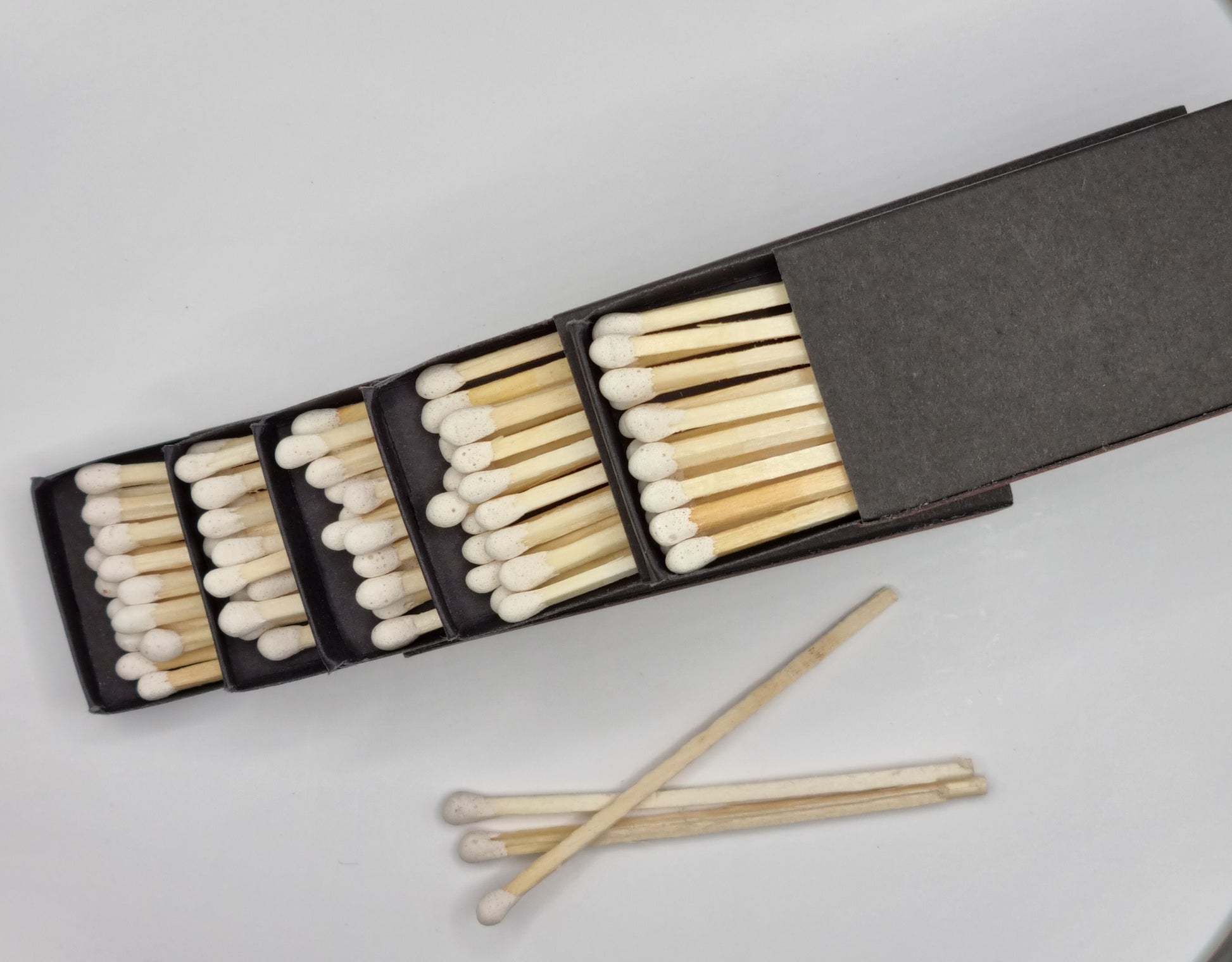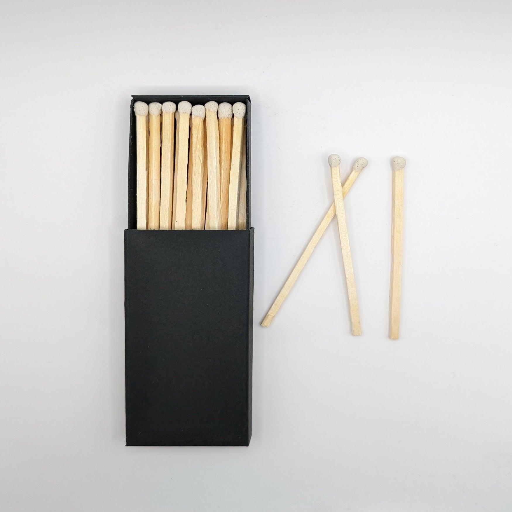 A box of approximately 15 wooden matches packed in a slim black box. Each match has a white tip and is 8cm long. The perfect accessory for candles & tealights