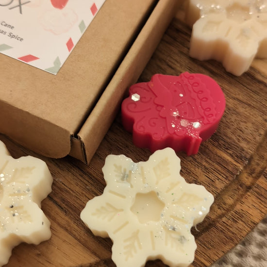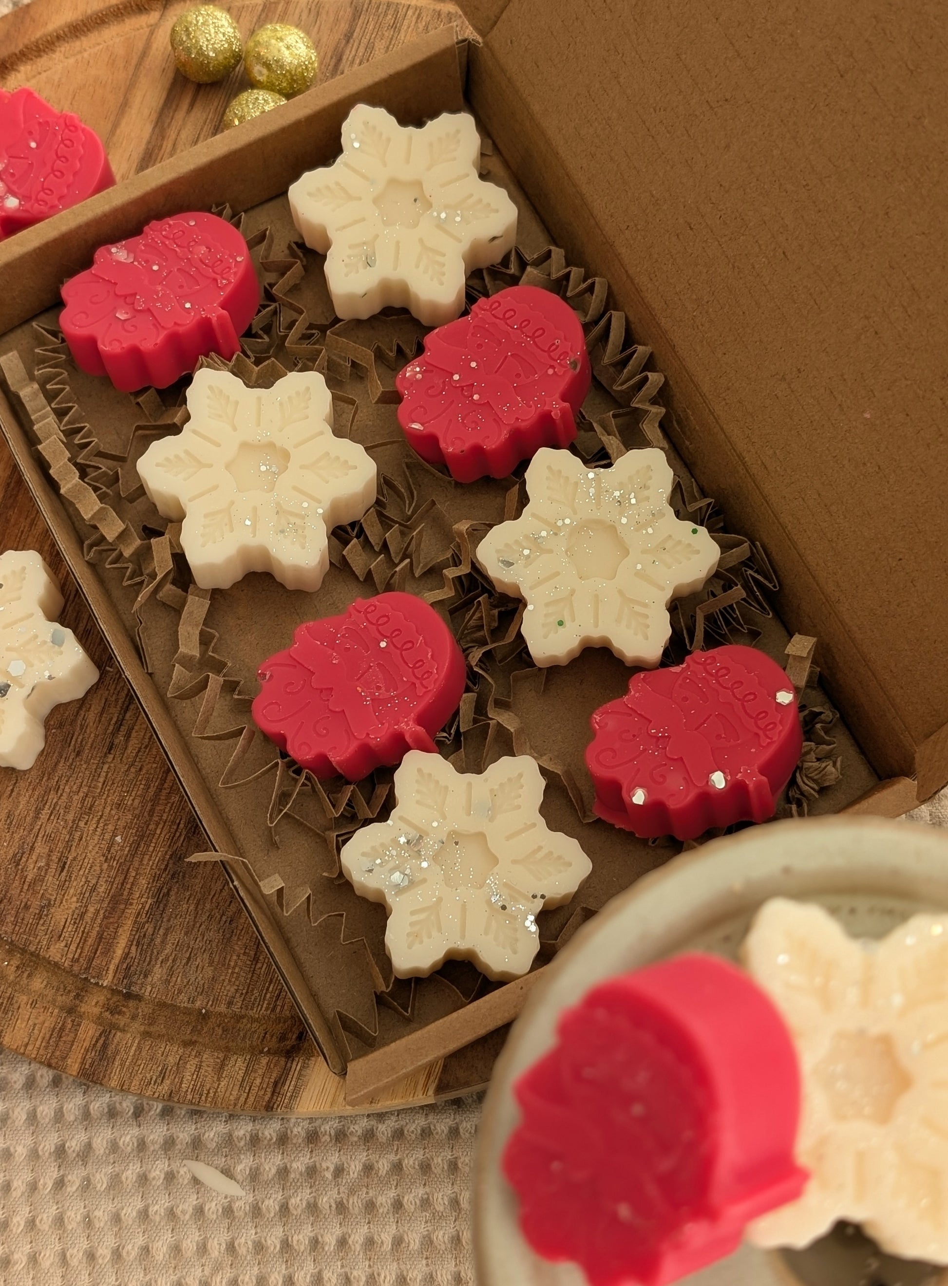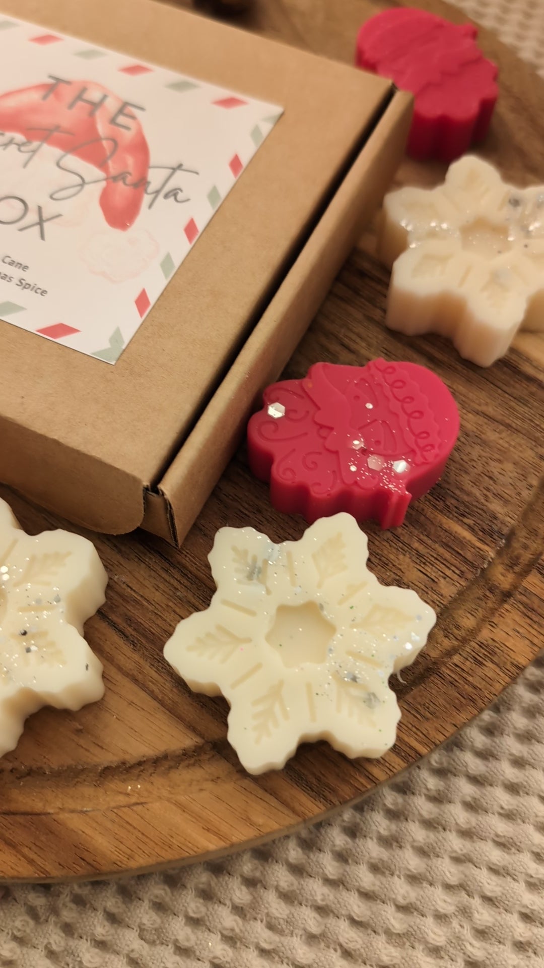 Chunky secret santa wax melts in 2 fabulous Christmas scents and shapes. Handmade with a glitter that shines as the wax melts.