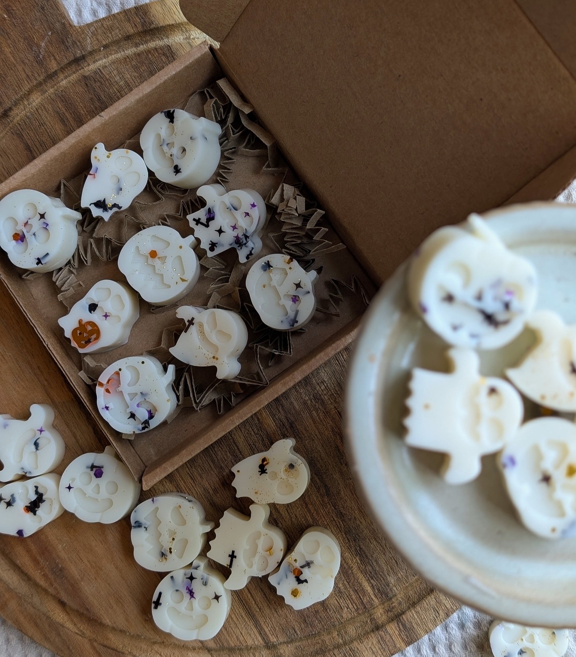 Chunky Halloween wax melts in 2 seasonal scents and shapes - perfect for a boo box. Hand decorated with Halloween theme glitter that shines as the wax melts.